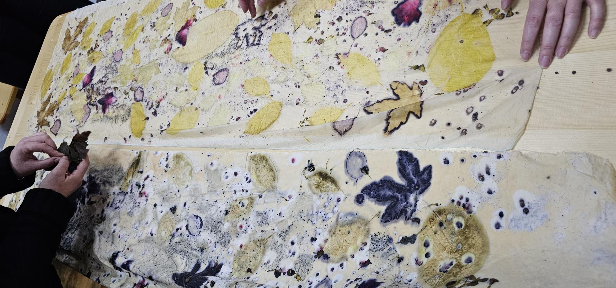 Párosával dolgozva, egymás munkáját segítve, a mesterek útmutatásával a festéshez megfelelően előkészített selyemsálakat a foglalkozáshoz behozott változatos színű és formájú különféle levelekkel, virágokkal, növényi részekkel és egyéb festőanyagokkal volt lehetőségünk telehinteni, esetleg azokat minta szerint elrendezni.