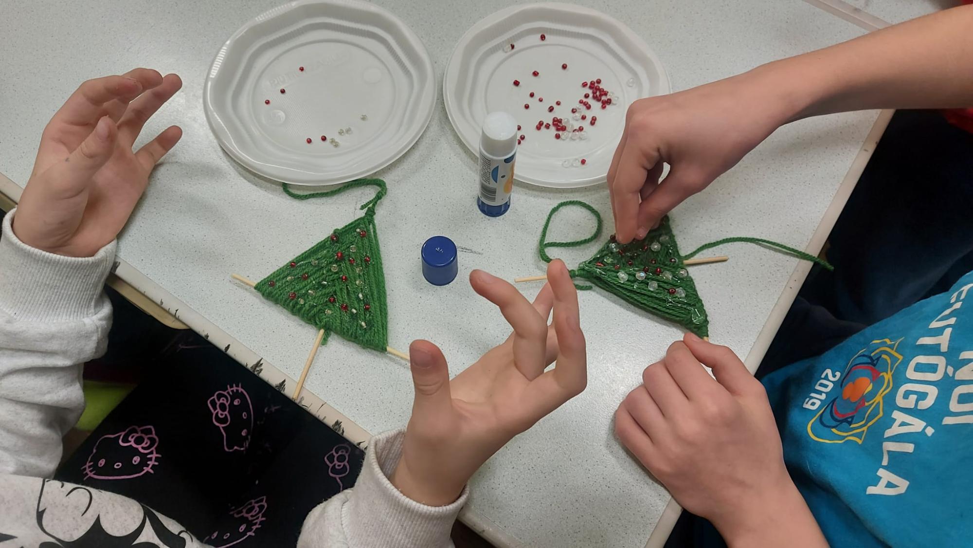 A nagyobbakkal hurkapálcákból és zöld színű fonalból készítettünk fenyőfa alakú karácsonyfadíszeket. A kihívást a fonalak tekerése jelentette a pálcák körül, de mindenki megbirkózott a feladattal. Az elkészült munkákat végül saját fantáziájuk szerint díszíthették ragasztóval és színes, csillogó gyöngyökkel, fűzőszálakkal.