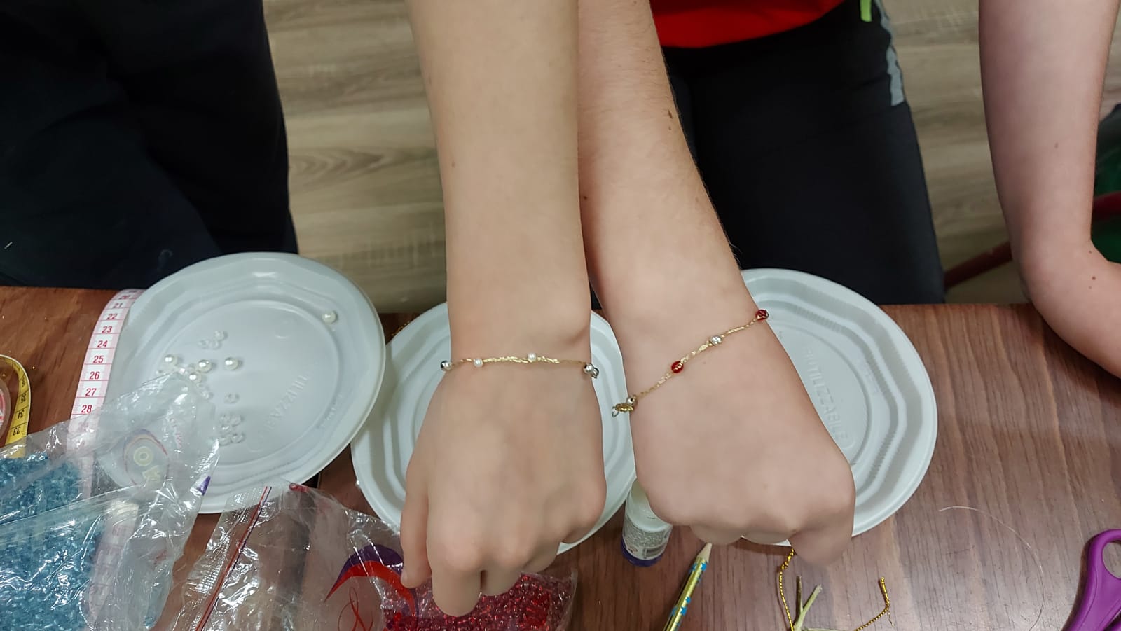 A komolyabb, drótos mintát egy jelen lévő felnőtt készítette el. Ha már a drót előkerült, és a gyöngyök sem mentek kellően korán haza, a lányok (kérlelésüknek nem lehetett nemet mondani) megtanulták a nap végére, hogyan lehet drótból és gyöngyből karkötőt fonni.